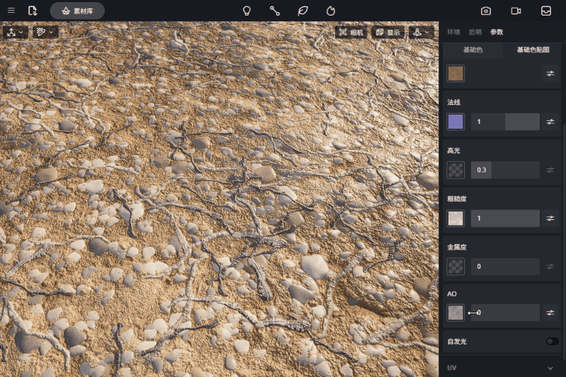 控制AO贴图的对基础色贴图影响程度,数值范围是0-1,数值为1时,AO效果最强,数字为0时,AO图对材质没有影响。