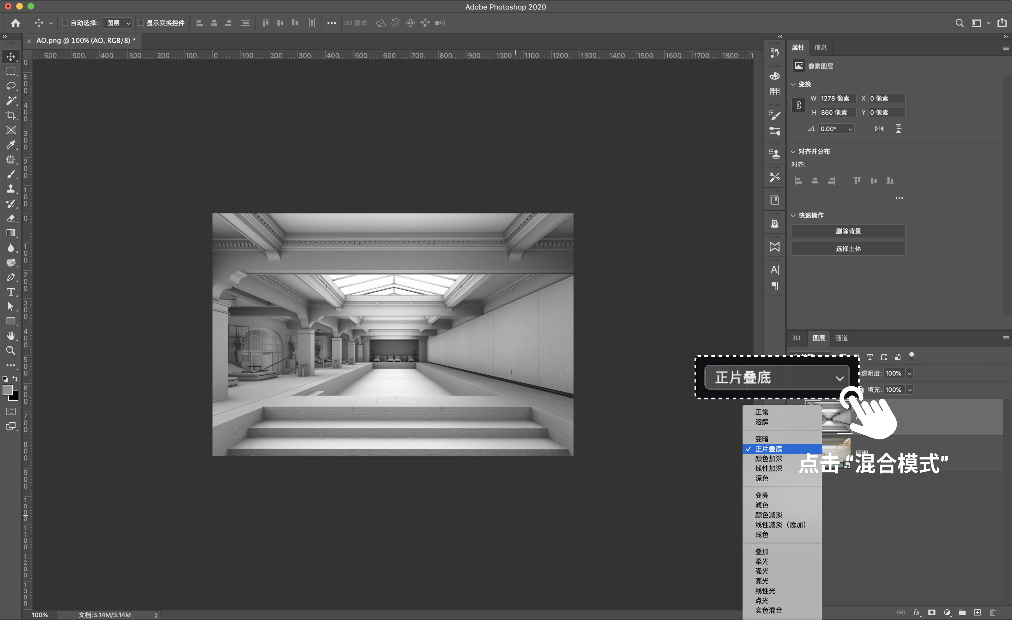 导出AO通道图后,将环境光遮蔽图拖入PS中,将该层的混合模式改为正片叠底叠或是颜色加深。