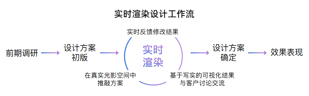 具体来说,欧博之前与大多数的设计团队一样,只会在最后的出图阶段使用渲染器。但现在他们调整了工作流程,在设计推敲和展示阶段也会借助实时渲染,将设计成果实时可视化展示出来。