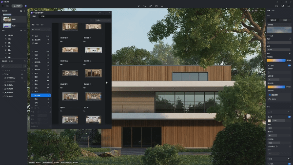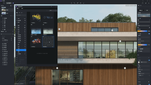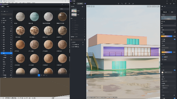 材质部分,D5素材库提供了2000+ PBR材质,简单点击即可赋予材质,另外还有焦散、置换等多种材质模板可以使用。实时光线追踪精准还原材质质感,展现丰富细节。