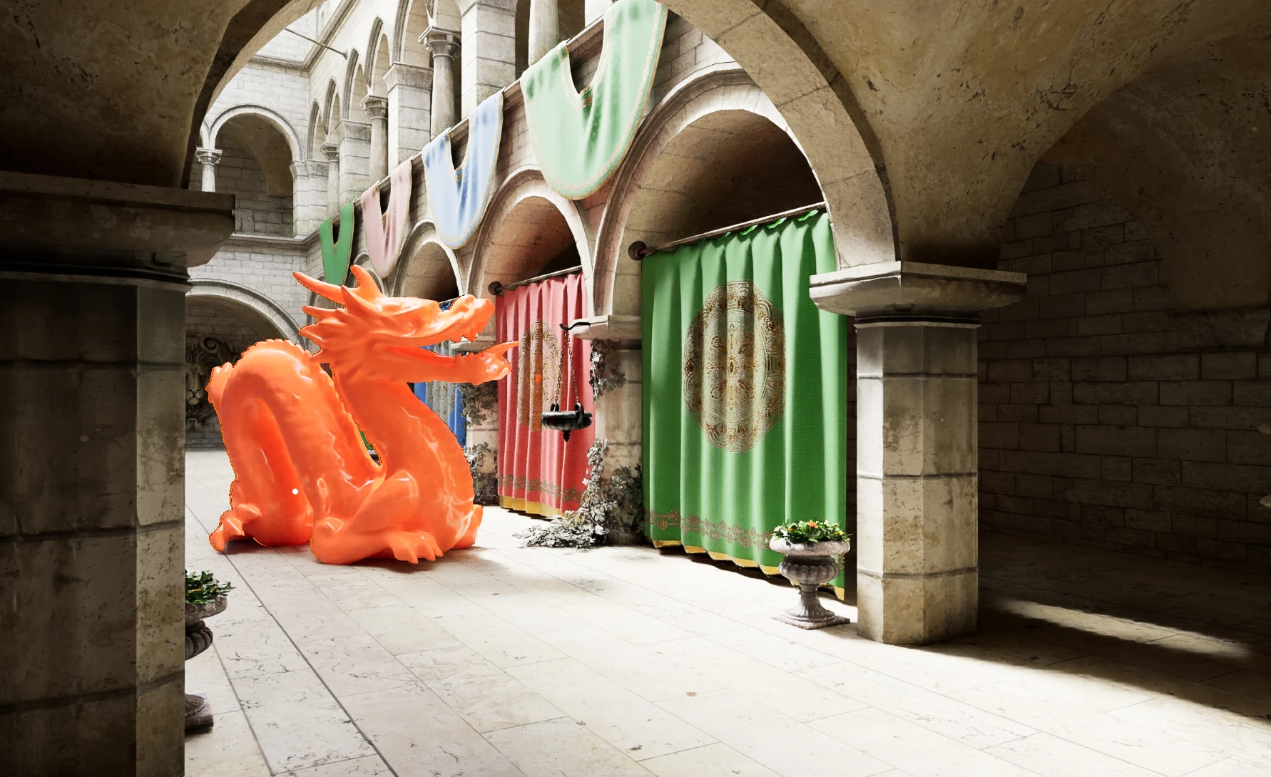 | 最终产出效率 | 离线路径追踪 (Offline Path Tracer) 若追求物理级真实画质,必须切换至传统的 Path Tracer。其收敛速度呈线性,需要堆叠海量采样数,导致单帧渲染耗时极长 (分钟/小时级),无法实时交付。 | 极致并行的实时渲染 (Extreme Parallelism) 基于高性能的现代GPU架构与实时路径追踪算法,极致压榨GPU并行效能,实时帧率下达到接近离线路径追踪的画质。收敛速度显著提升,出图时间大幅缩短。 |
