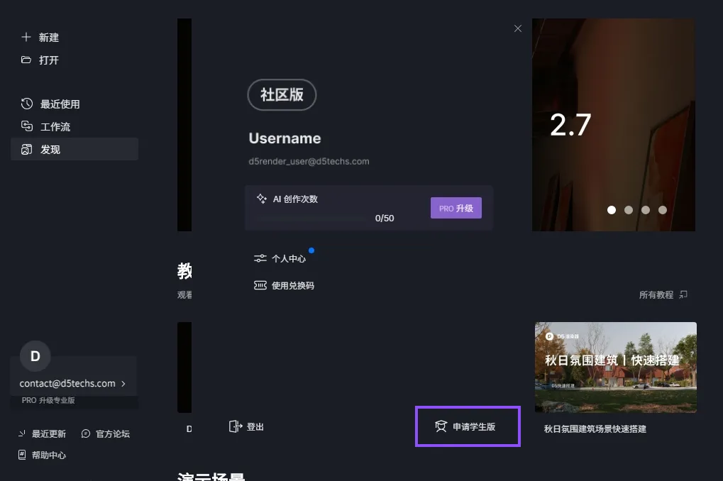 通过申请后,该账号会从“D5社区版”自动升级成为“D5学生版”,有效期 180 天,到期后可以继续按照流程申请续期,每次延长 180 天时长,直到毕业。