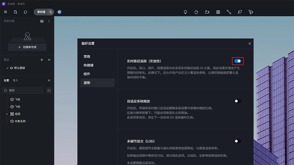 默认情况下,自定义参数开关处于关闭状态,D5 渲染器默认参数配置即可完成高质量的图片和视频渲染。用户也可以根据自己的需要,调节自定义参数,自行控制画面质量和渲染时间的平衡。