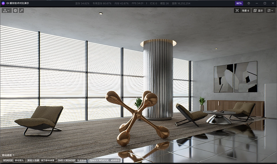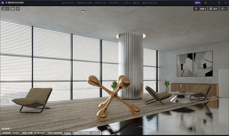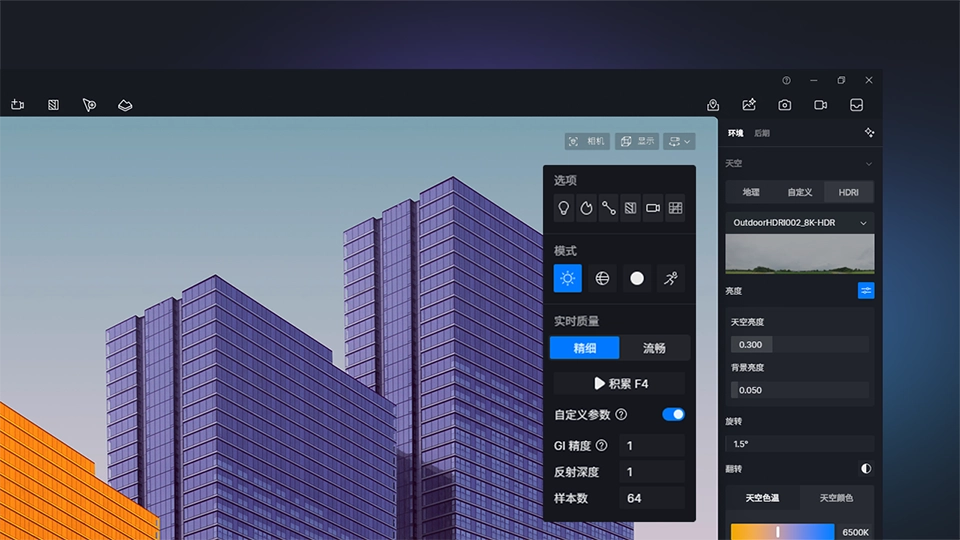 自定义参数中的“GI 精度”、“反射深度”、“样本数”会同时影响积累预览、出图和出视频的画面质量。按下“积累”按钮,画面会进入静态模式,并且会根据用户指定的参数持续积累,在实时视口中便可预览到接近最终成果的品质。