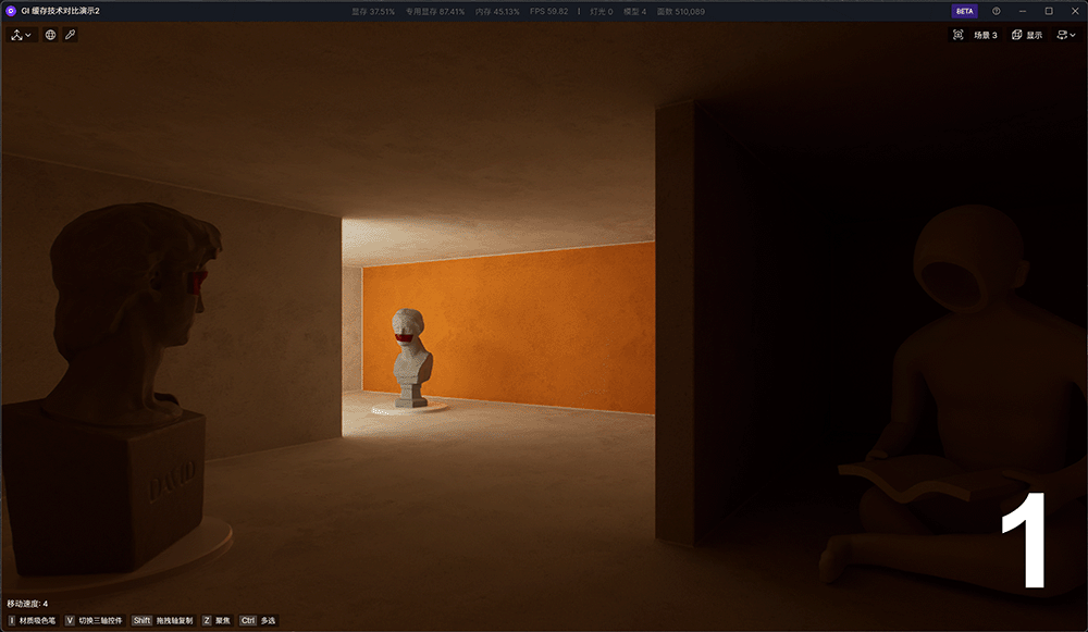 启用此功能后,实时渲染视口会立即切换到实时路径追踪 GI 算法,可以观察到实时渲染结果的改进。