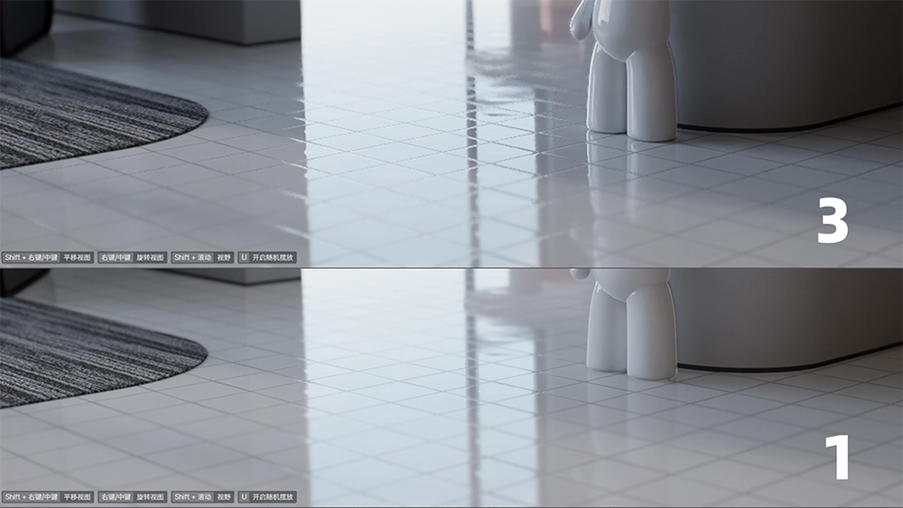 控制高反射材质互相反射的次数,此参数越高,高反射材质的表现就越准确。在示例场景中,高反射的地面上有一个同样高反射的玩偶摆件,这是反射深度为 1 和反射深度为 3 的对比结果,我们可以清楚地看到,参数越高,所能体现的反射细节就越丰富。