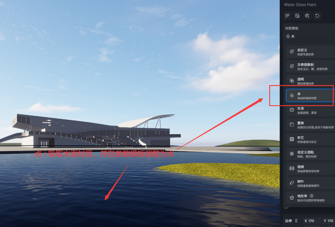- 材质及环境调整:对建筑及周边环境的材质进行调整,遵循由大入小的原则,先进行粗调,再根据整体效果进行细调。具体包括水面材质、天空大环境、玻璃材质、建筑墙面材质、草地材质等的调整,以及远景环境的打造,以营造出逼真的渲染效果。