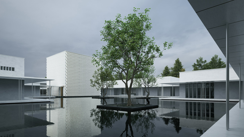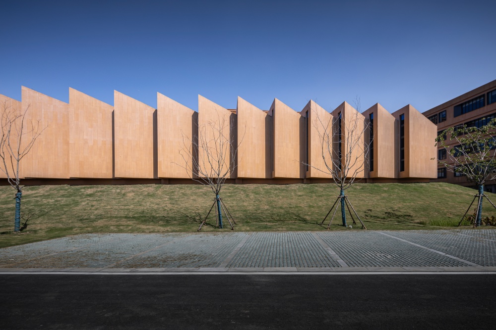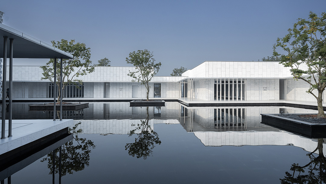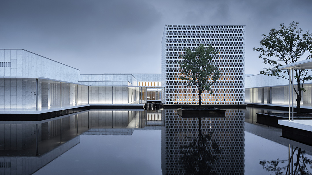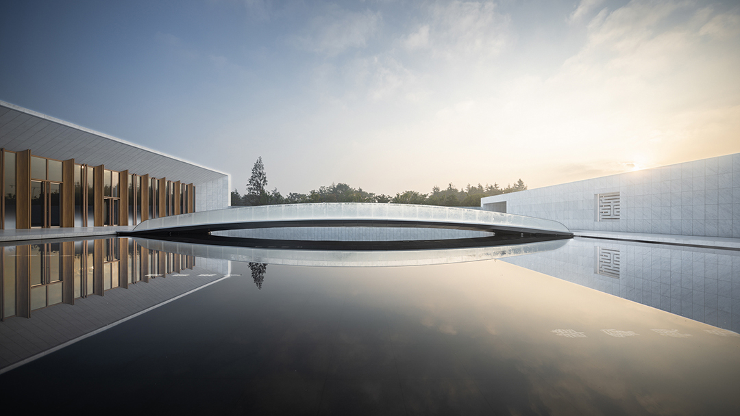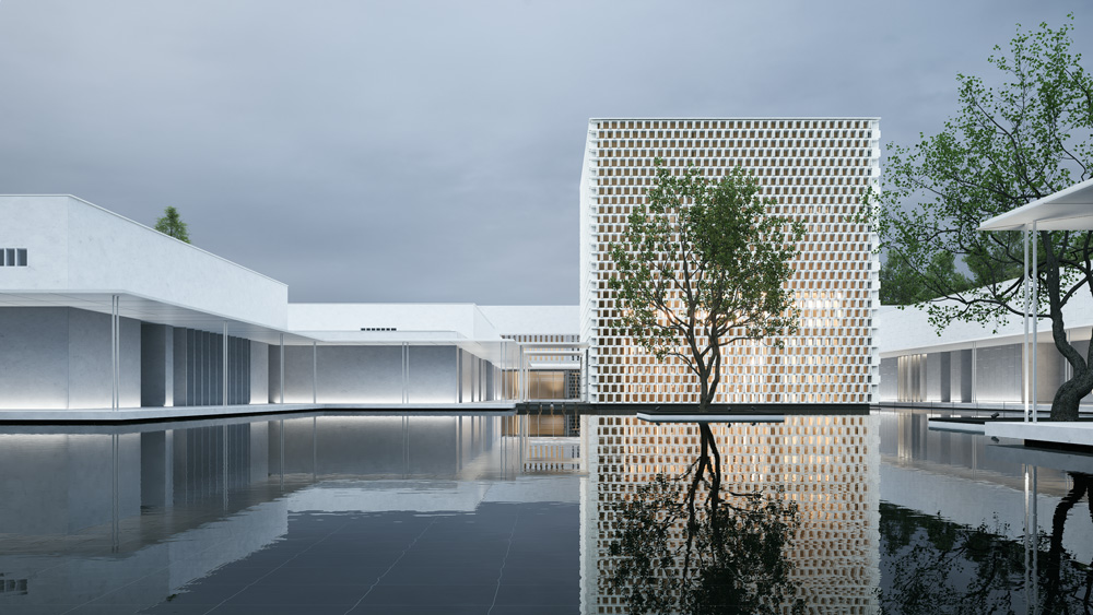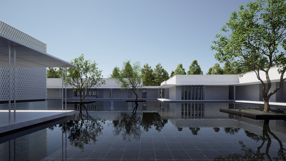 白墙黛瓦的水乡风韵点缀木色竹简的文化符号,与现代简约的建筑意象叠加贯穿于团队的整体设计思路,平直、方正的建筑线条掩映在周边草木葱茏的环境中,融为一体。整体的氛围感,是盘育丹强调的设计重点: