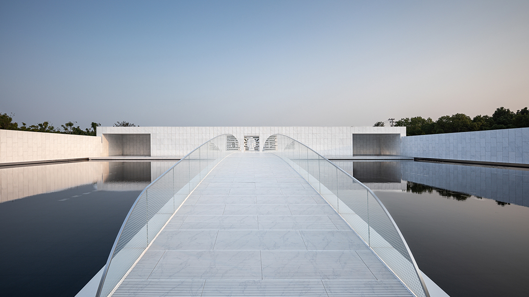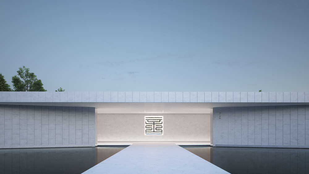 空间序列的设计灵感源自《桃花源记》,通过一段路径到达新空间的手法化用于建筑之中,强调一个合围的内向性空间,曲径通幽,移步换景:从镂空的“言”字照壁,到前院拱桥,实现空间内外和黑白色彩的交融,再抵达最后的水院,曲廊回环,贤人厅立于水中散发柔和的光芒。