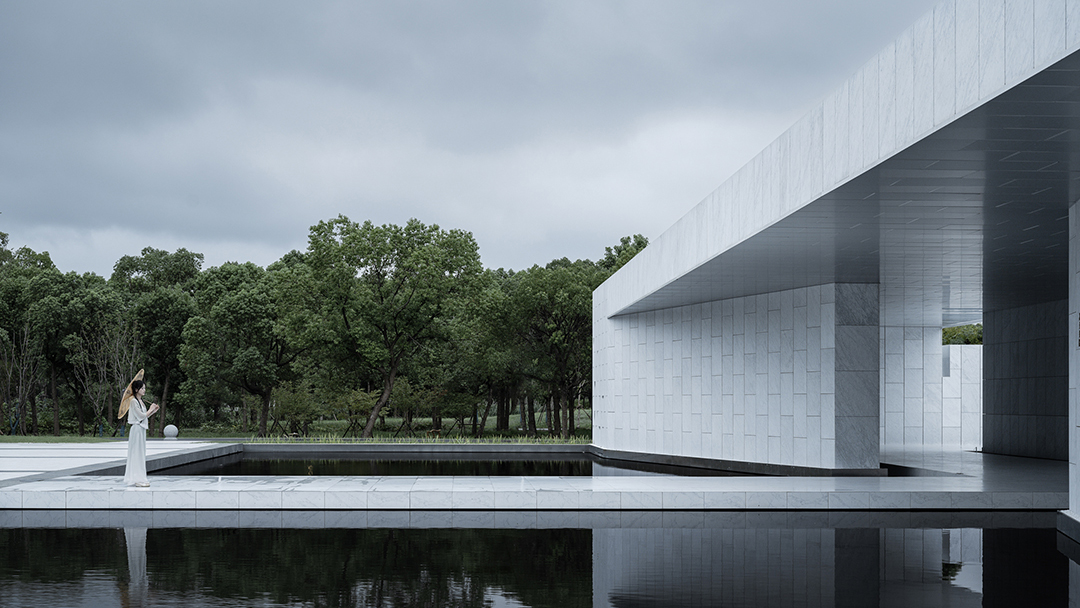 建筑整体外立面采用了白色大理石,而在内院水池以黑色的石材铺底,浮现白色篆体诗文,黑白之间体现水墨渲染的氛围感。而后院的三棵乌桕树在黑白墨色画卷中点上三抹绿意,成为了水面的三处焦点,再一次渲染出了水乡之美。