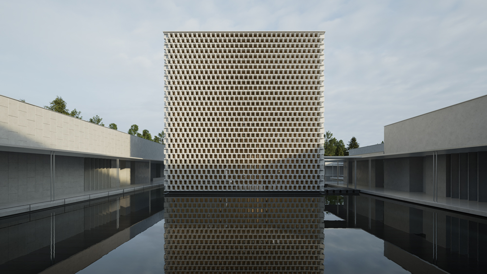 据何院士团队建筑师钟语回忆,言子书院建筑立面材质的选择就持续了几个月的时间,团队在D5中进行各种不同材质效果的表现和推敲,希望书院的立面能够营造出一种纯洁宁静的氛围感,因此考虑整体颜色应为白色。在定下白色的基调后,起初团队考虑以白色石材作为立面表现效果的媒介,在十几种白色石材中反复比对。