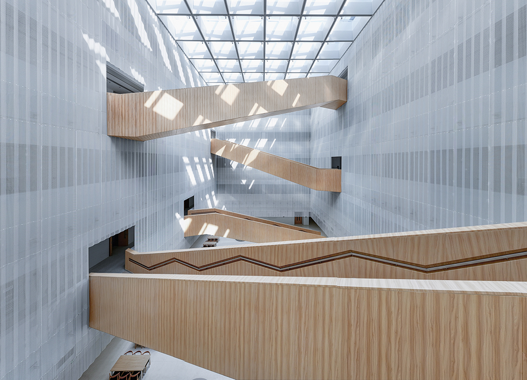 这种刻画入微的匠心在言子书院项目中随处可见:白色立面加入木色点缀,两两成对的仿木铝板模拟出竹简的形制。