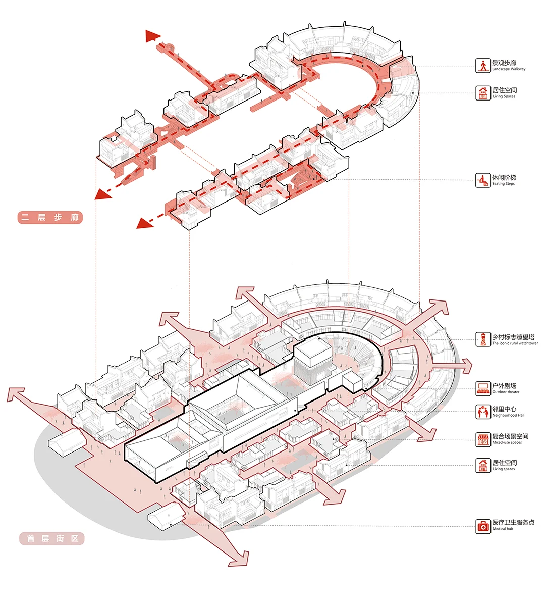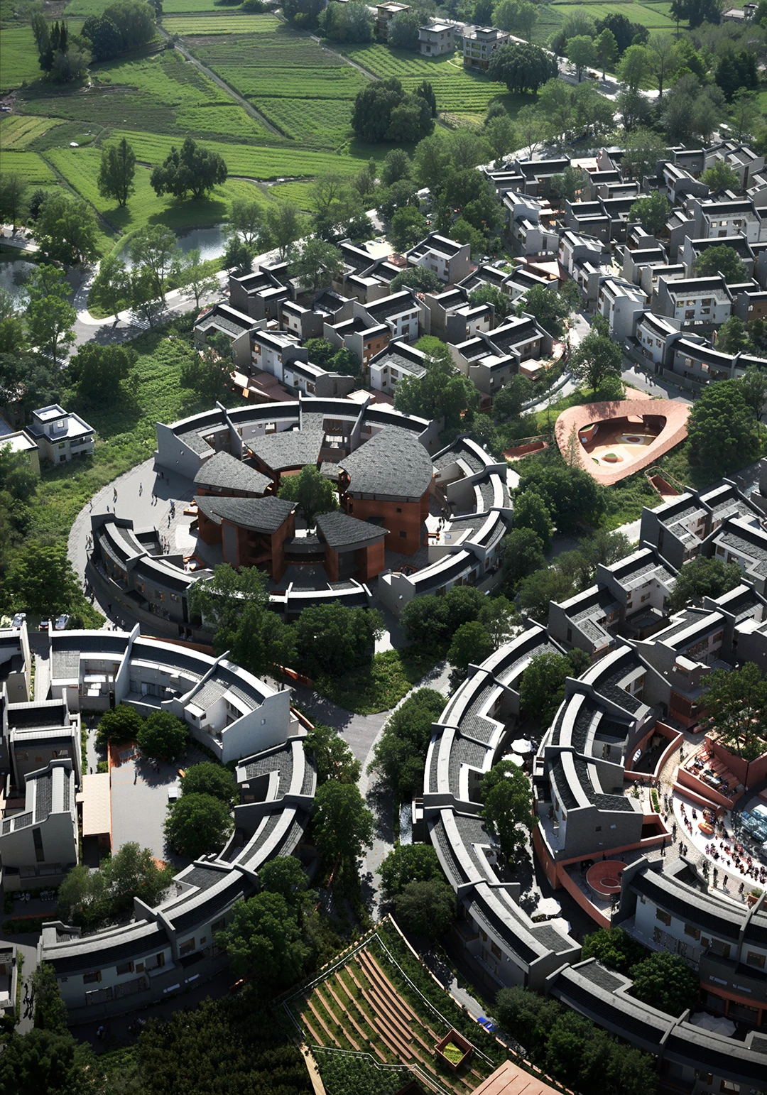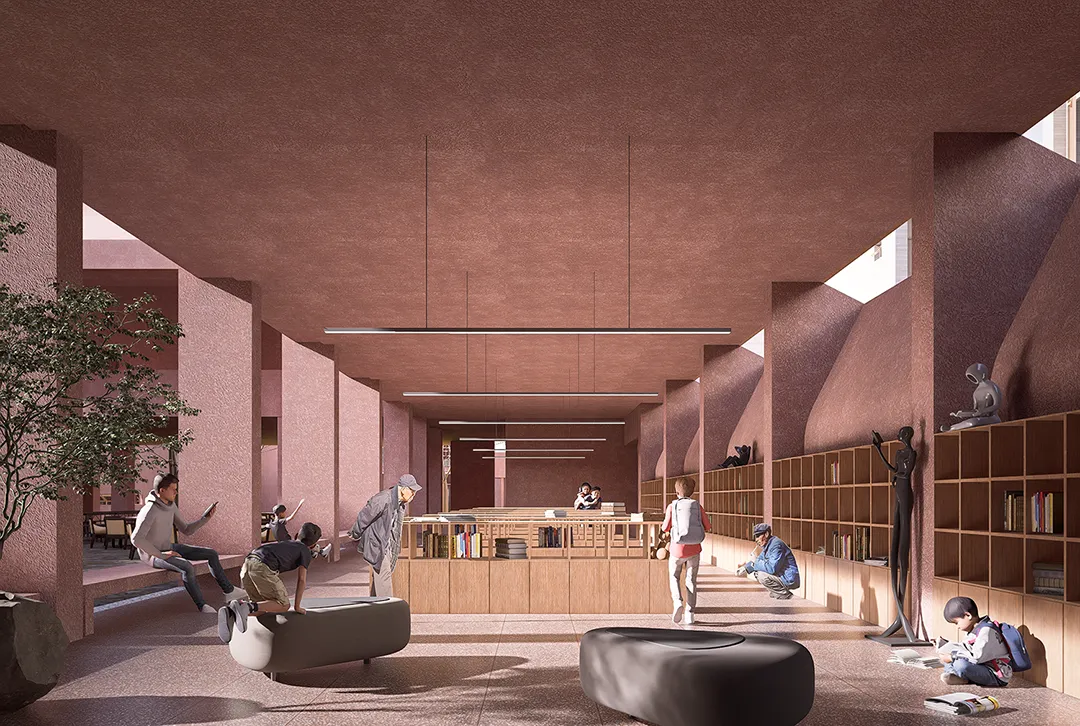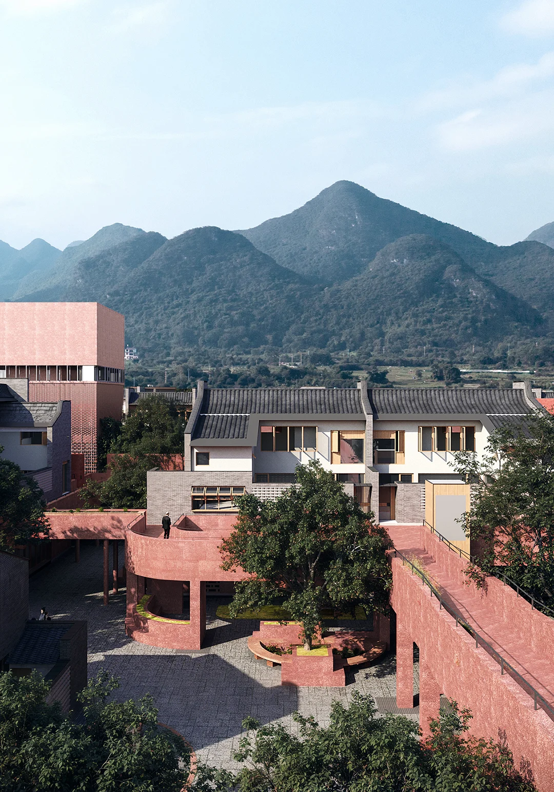 公共底盘串联核心区与外围居住组团,形成连续的生活环路,并统一采用具有地域特征的红砂岩肌理涂料作为基座材料,构建清晰、可读的公共界面,回应围龙屋的空间逻辑。