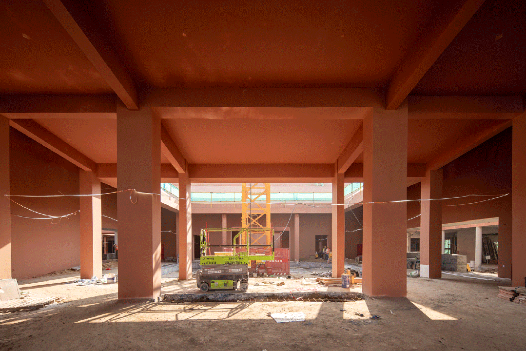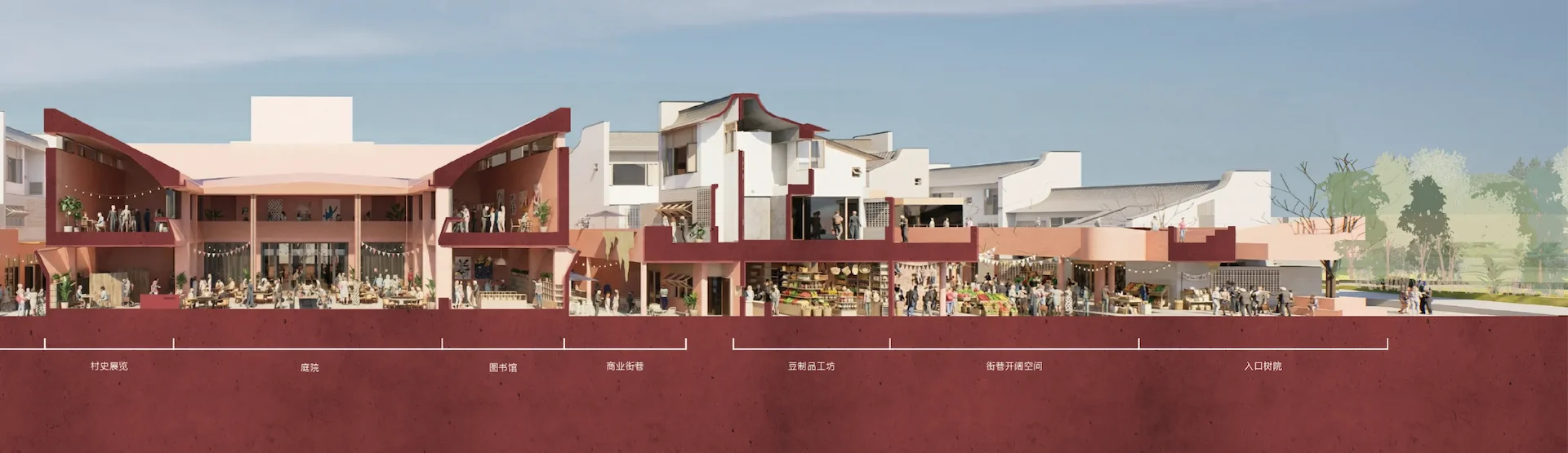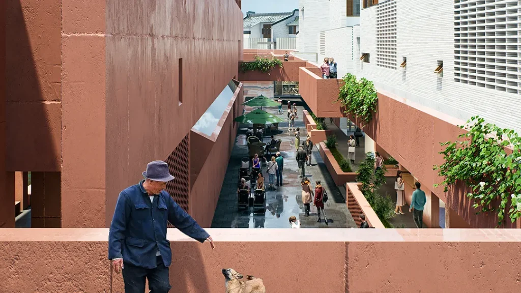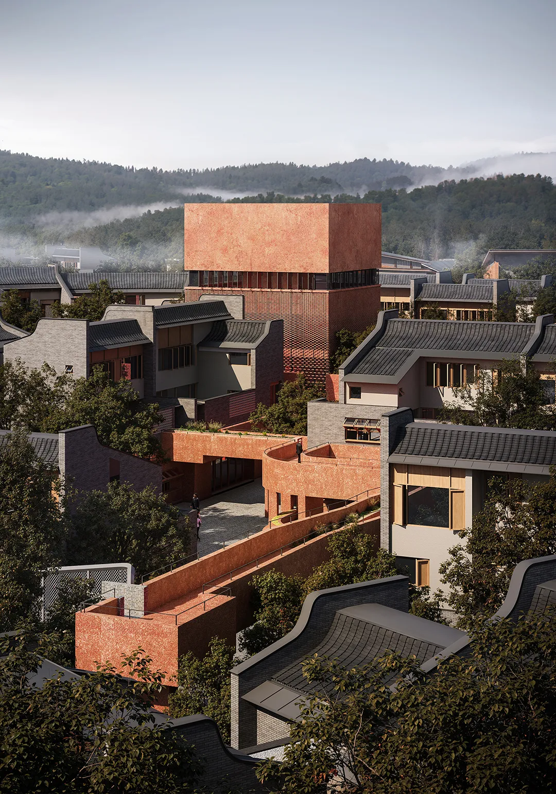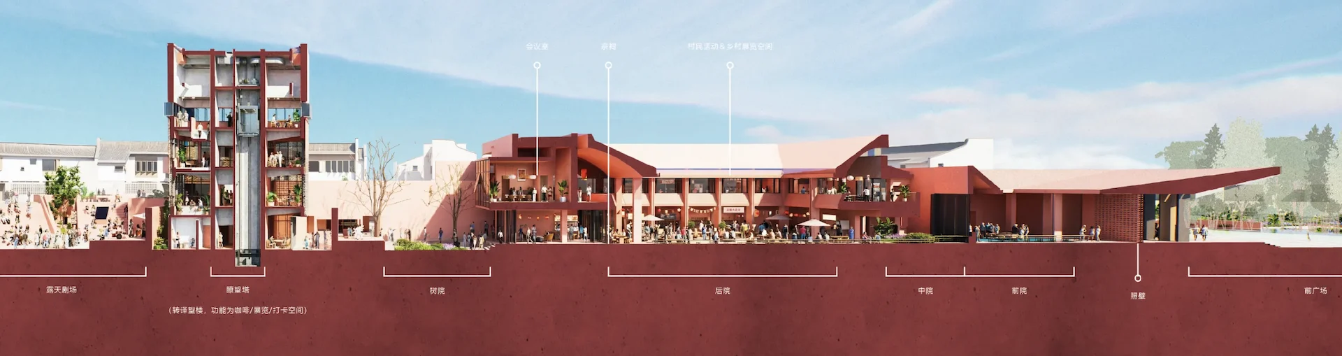 公共底盘串联核心区与外围居住组团,形成连续的生活环路,并统一采用具有地域特征的红砂岩肌理涂料作为基座材料,构建清晰、可读的公共界面,回应围龙屋的空间逻辑。