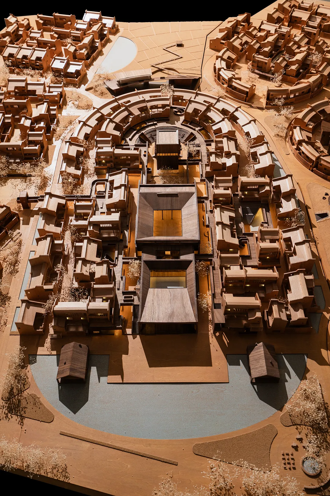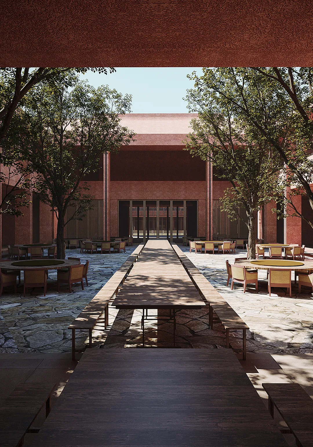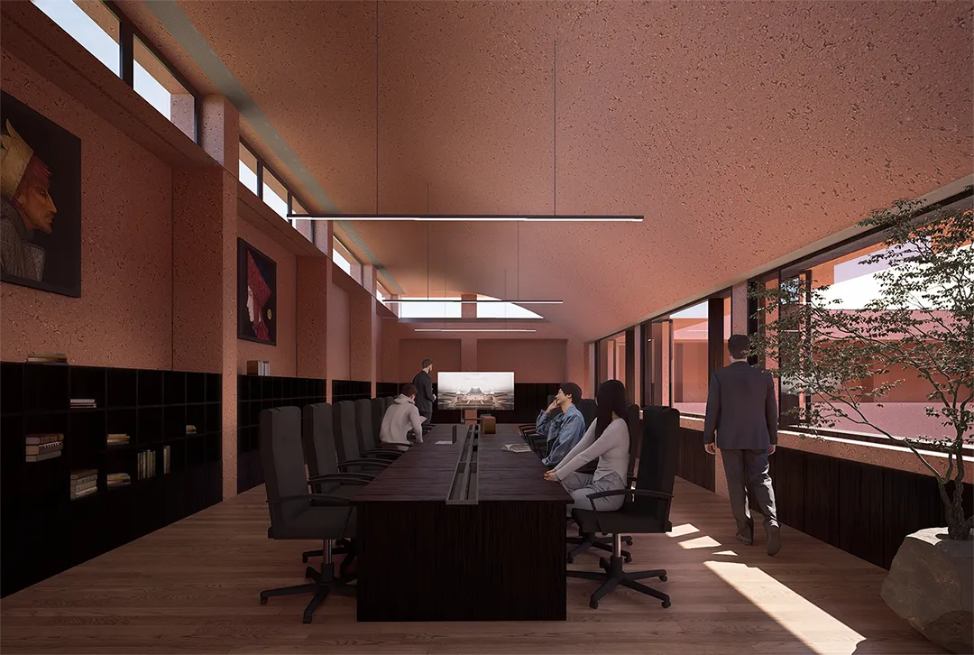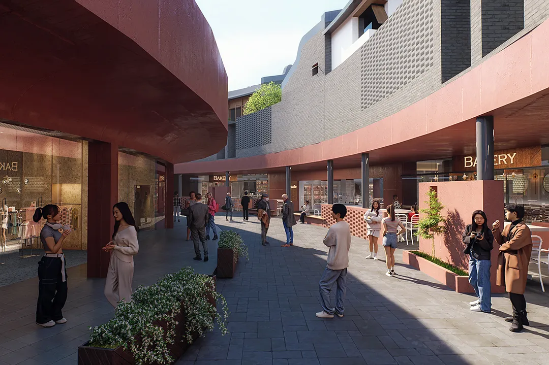 公共底盘串联核心区与外围居住组团,形成连续的生活环路,并统一采用具有地域特征的红砂岩肌理涂料作为基座材料,构建清晰、可读的公共界面,回应围龙屋的空间逻辑。