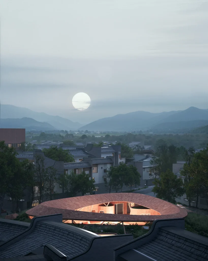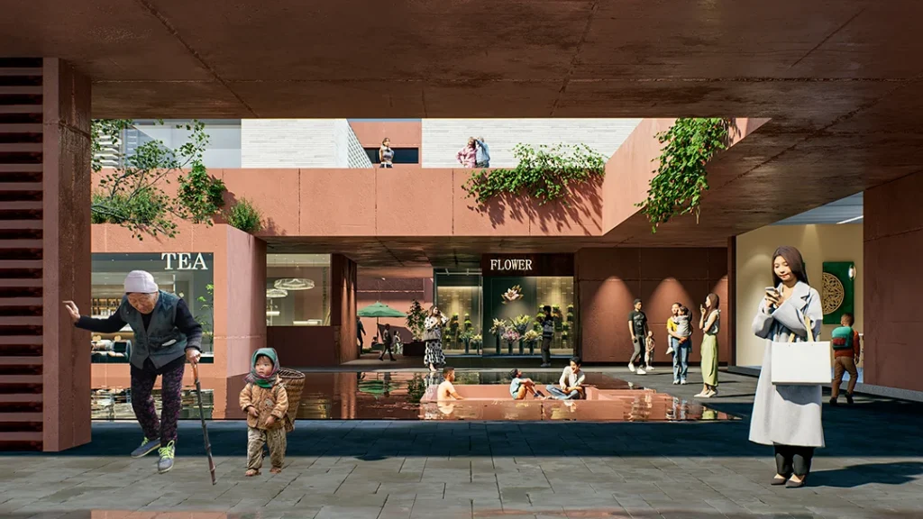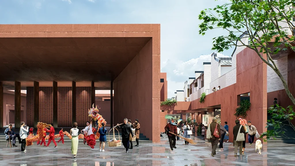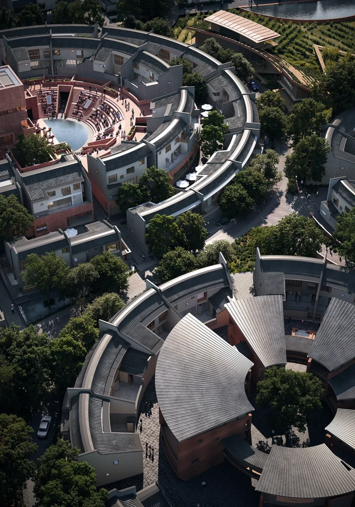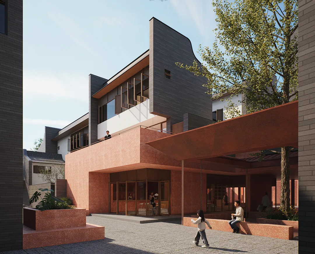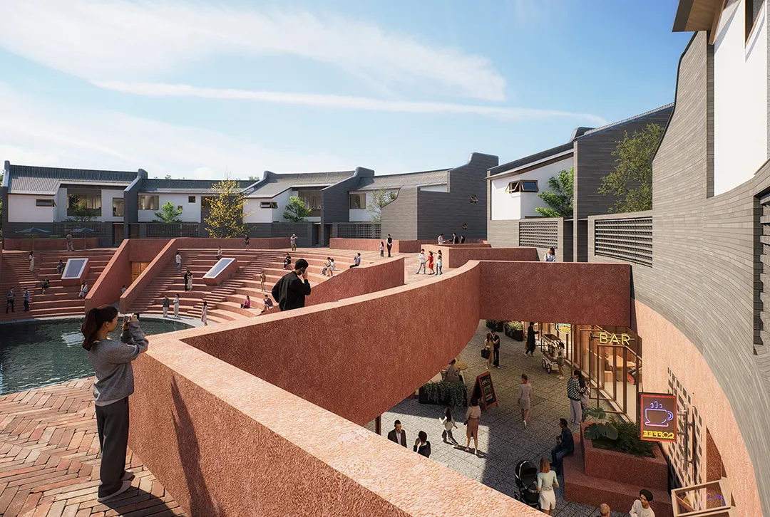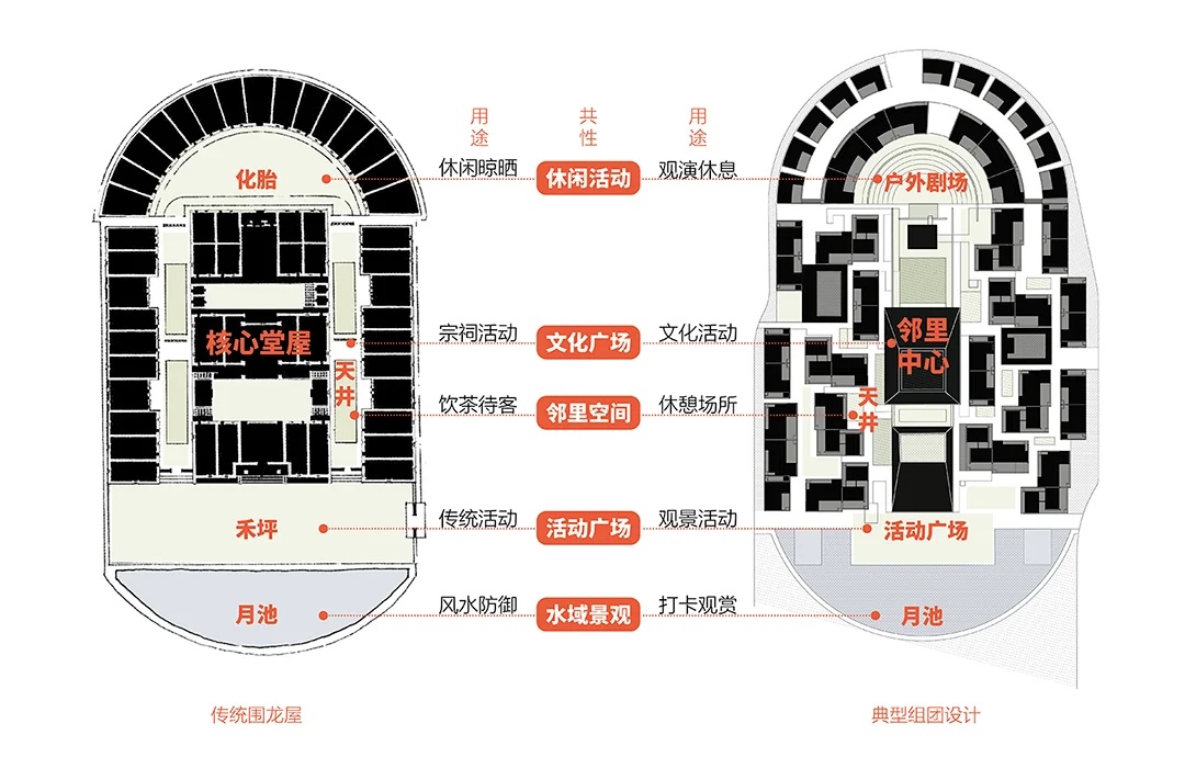 “月池”不再只是防火防旱功能,而成为社区入口的精神图腾与景观核心;传统堂屋转化为承载商业与邻里交往的公共中心;轴线尽端的“化胎”空间,则被演绎为半户外的社区剧场,串联起一条面向当代生活的公共空间序列。