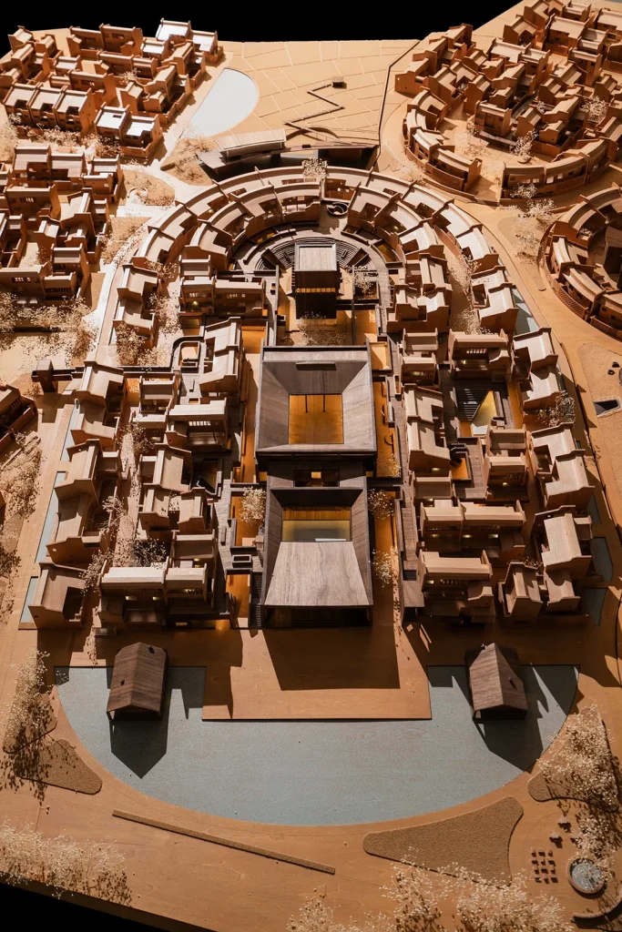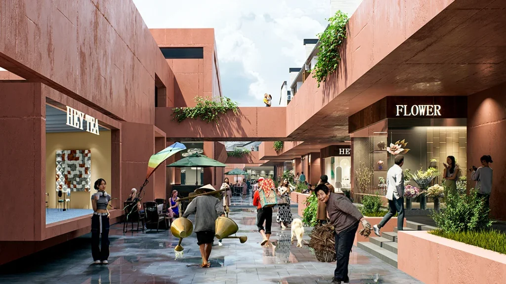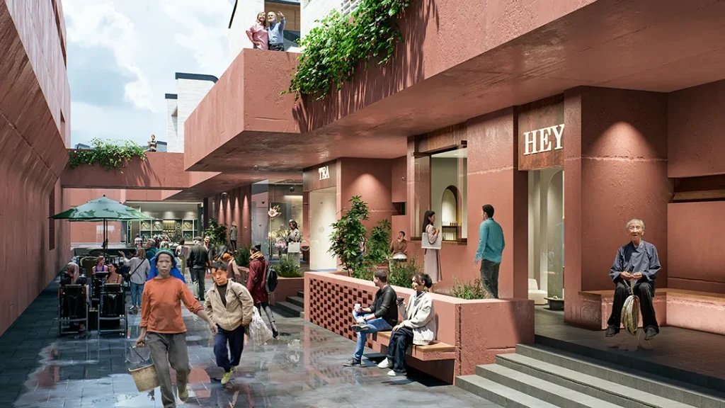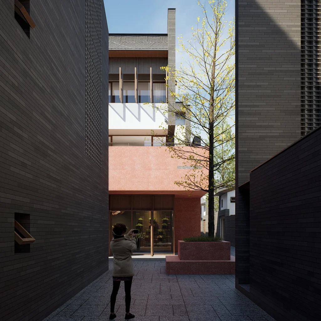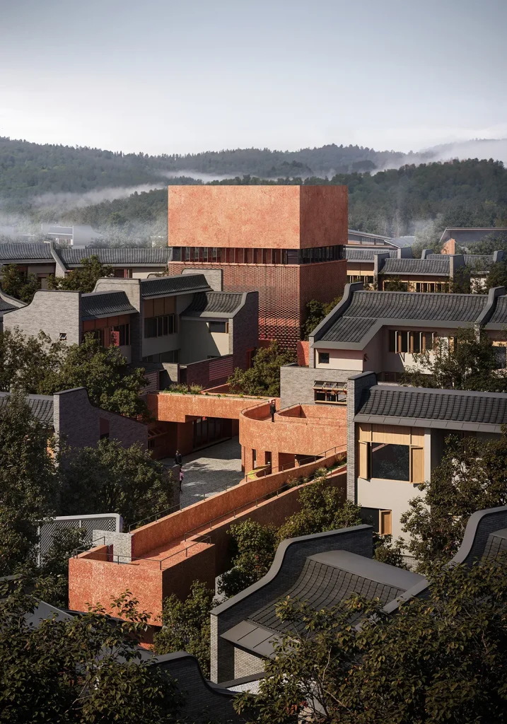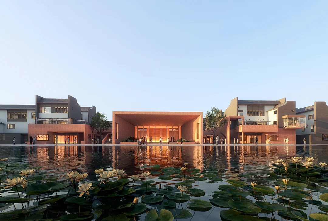 “月池”不再只是防火防旱功能,而成为社区入口的精神图腾与景观核心;传统堂屋转化为承载商业与邻里交往的公共中心;轴线尽端的“化胎”空间,则被演绎为半户外的社区剧场,串联起一条面向当代生活的公共空间序列。