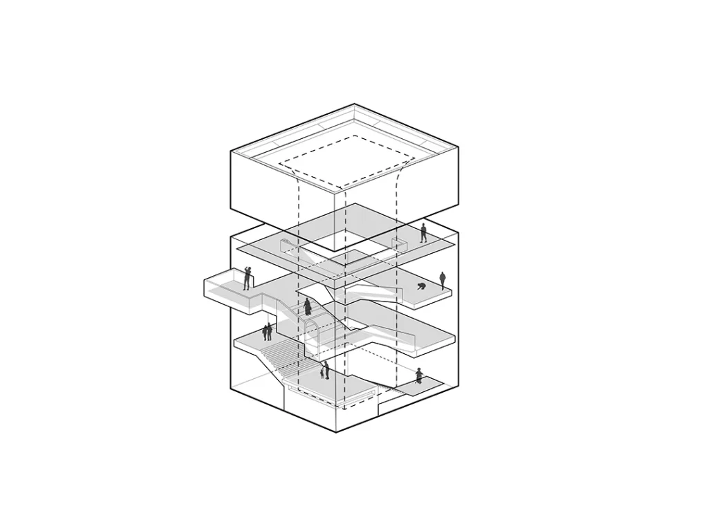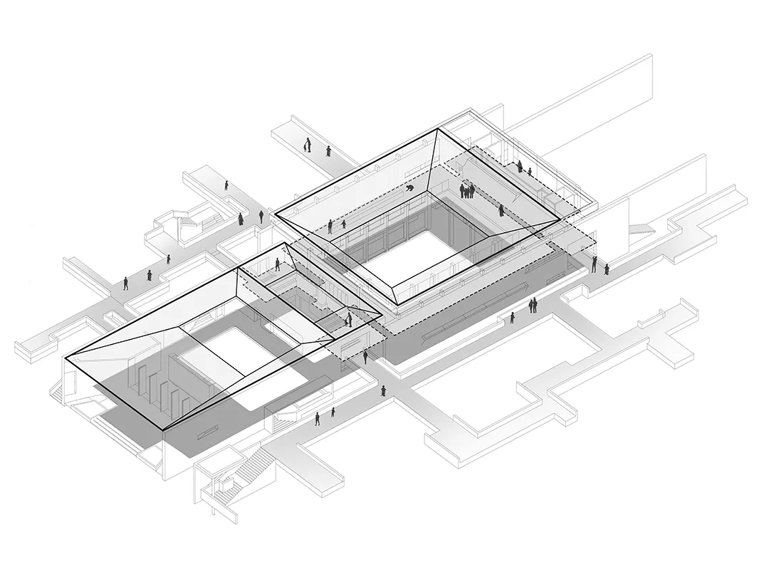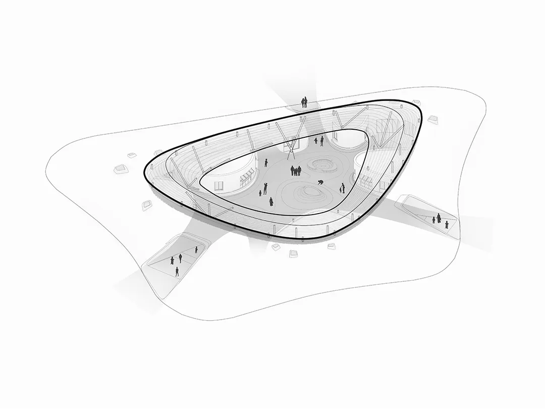 在此基础上,设计进一步将传统围龙屋的平面礼序进行立体化重构:教育、文化、活动与商业等公共功能整合至“三维公共底盘”系统之中。底盘上层为开放共享的公共活动平台,底盘下层则整合设备、物流与交通组织,使公共生活与运行系统各自独立而高效协同。