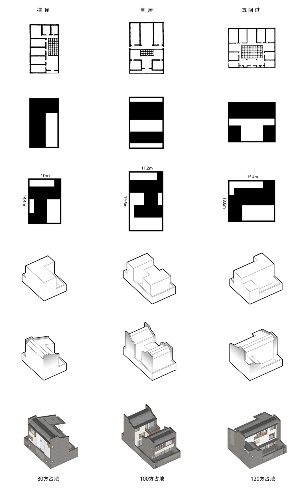基于调研结果,设计设定80、100、120平方米三种建筑主体占地模数,将传统客家民居的“横屋”与“堂屋”逻辑进行现代转译,对应三类群体的使用需求: