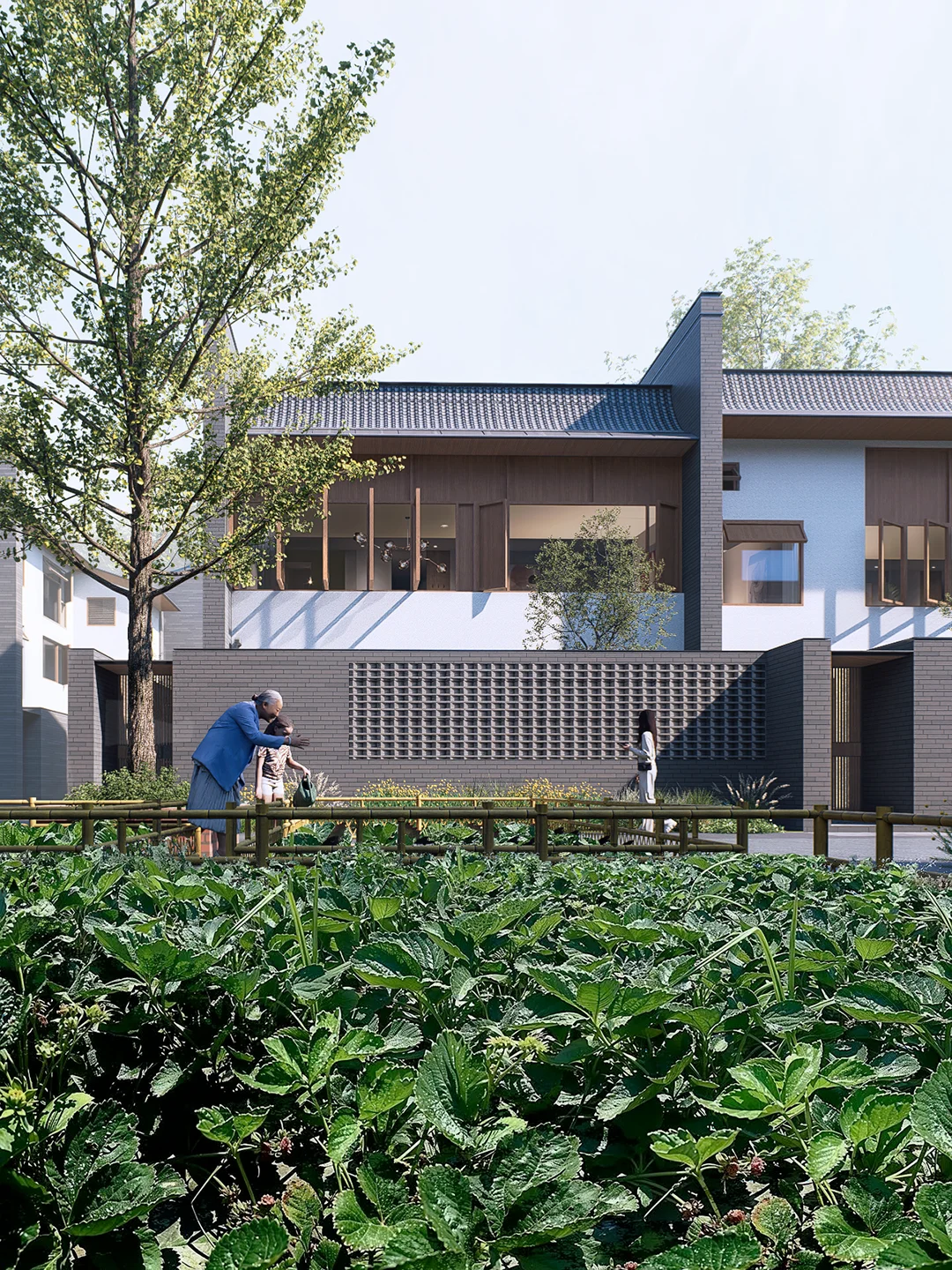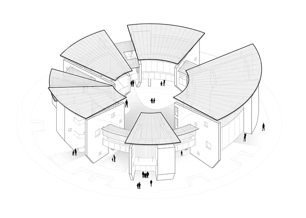 项目从“围龙屋”的聚落逻辑出发,通过三维公共底盘与类型学策略,回应原住民、返乡/双栖家庭与城市新住民三类人群的多元生活方式。