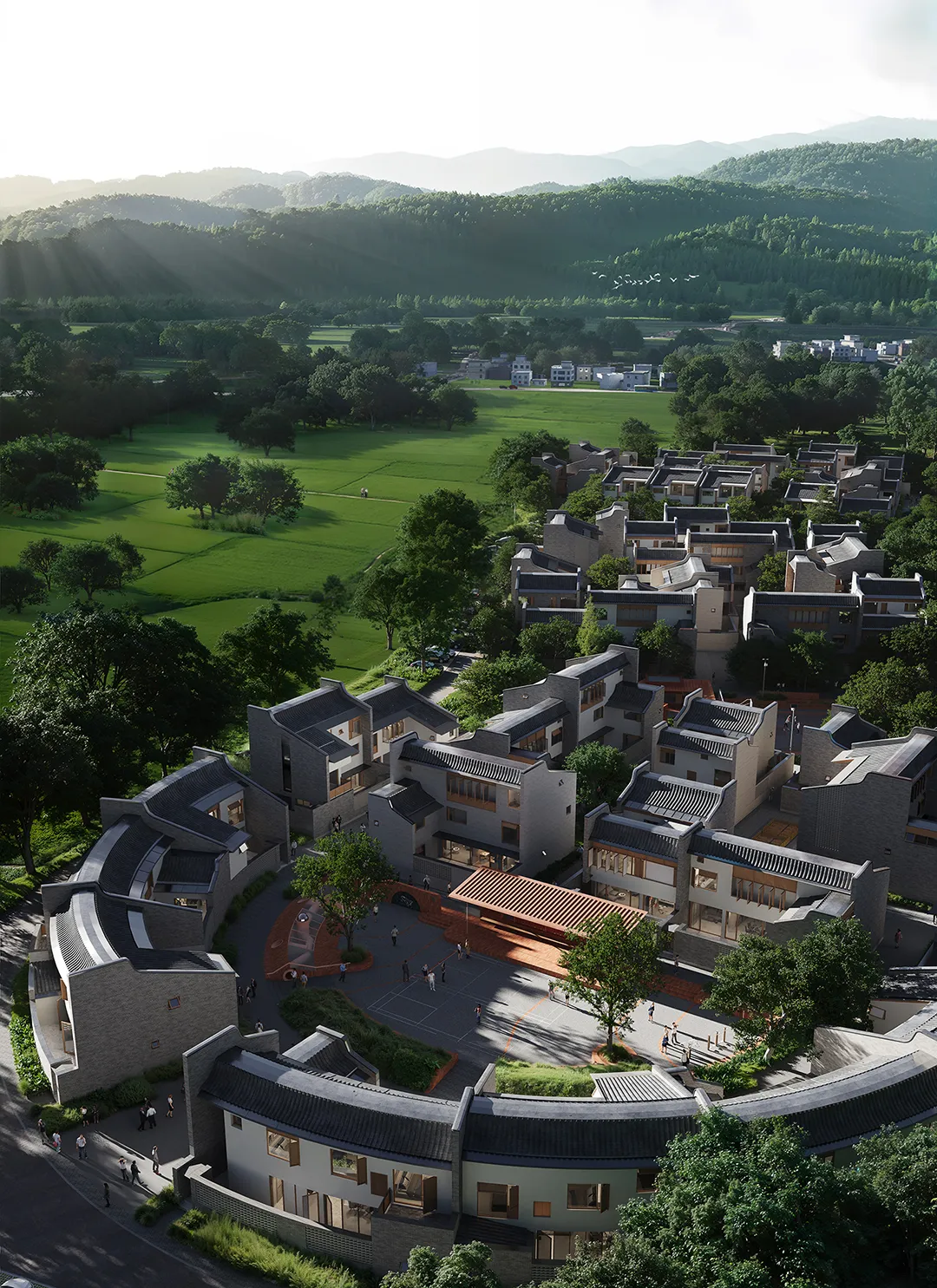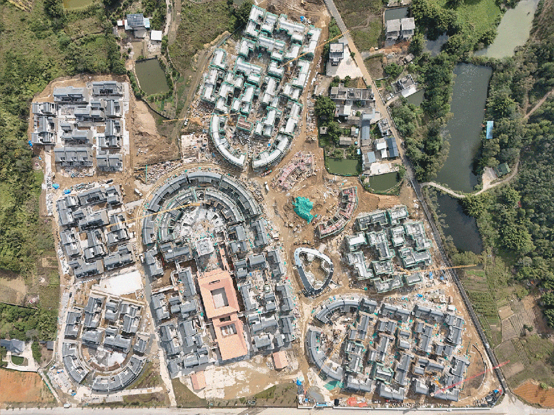 在效率导向下的乡村回迁房往往面临着“乡土性缺失”与“城市化均质”的双重困境。在惠州龙门,设计团队以中国乡村回迁社区的探索为契机,通过“围龙新居”探讨如何以当代建筑语言,重构客家民居的聚落逻辑与生活秩序。