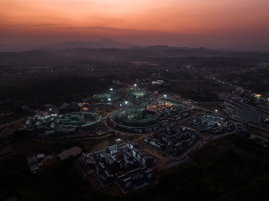 “以客家围龙屋的回环聚落为原型,通过三维公共底盘与类型学单元体系,重构乡村公共性、邻里尺度与生活秩序。围龙新居不仅仅是回迁社区,更是一场关于未来乡村的实验。”