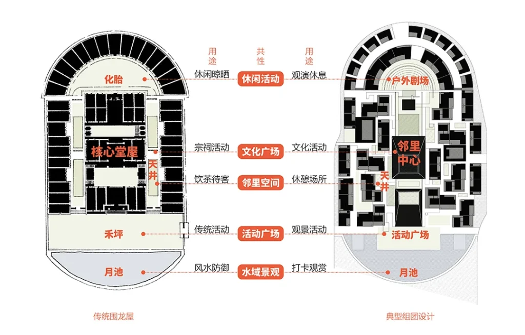 传统围龙屋“月池—禾坪—堂屋—化胎”的中轴序列,是平面的、礼制性的。设计保留了其精神节点,并转译为更适应现代生活方式的空间场所。