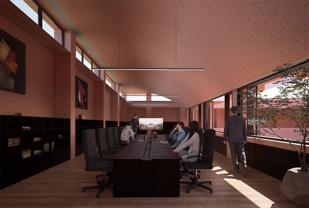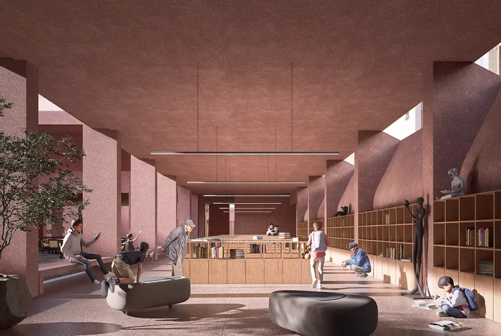 这一可开可合的院落体系具备高度适应性:日常状态下,廊道围合形成民俗展示与休憩空间;节庆时,院落可整体转化为长桌宴、仪式活动等大型公共场所。垂直维度上,二层设置党群服务中心、村民活动室与图书空间,并与三维公共底盘的居住平台直接衔接,形成立体而高效的社区公共服务网络。