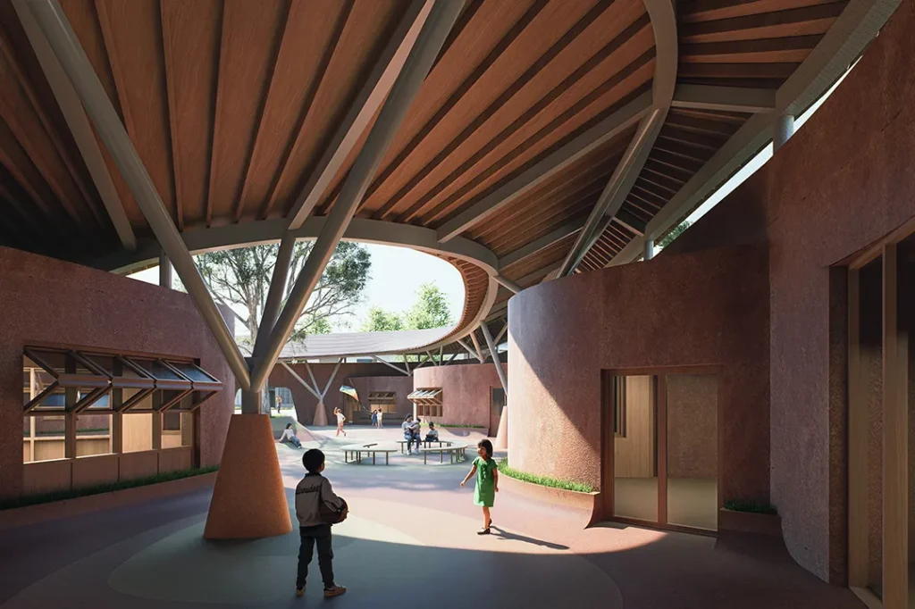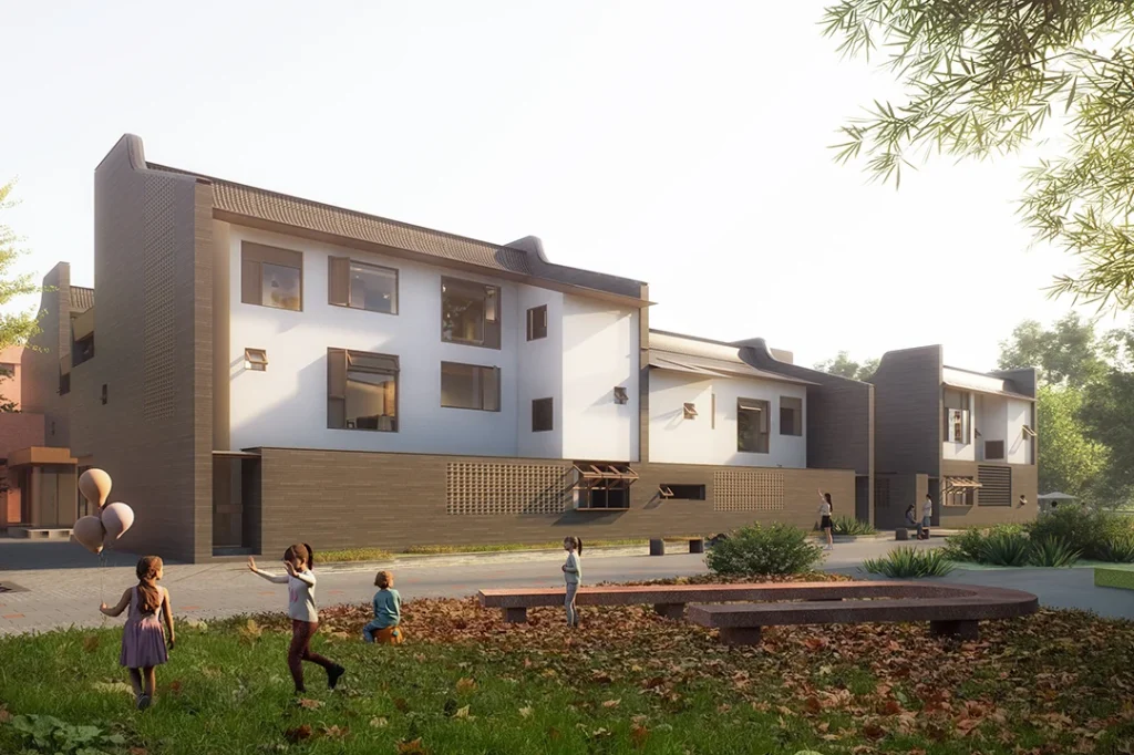 幼托所:位于组团之间的幼托所,采用中央庭院架空与局部地景化的策略。起伏的地面与遮阳避雨的半户外空间,为儿童创造了适应当地湿热气候的“全天候游戏场”。这里不仅是幼儿的乐园,更是向社区开放的街角口袋公园。