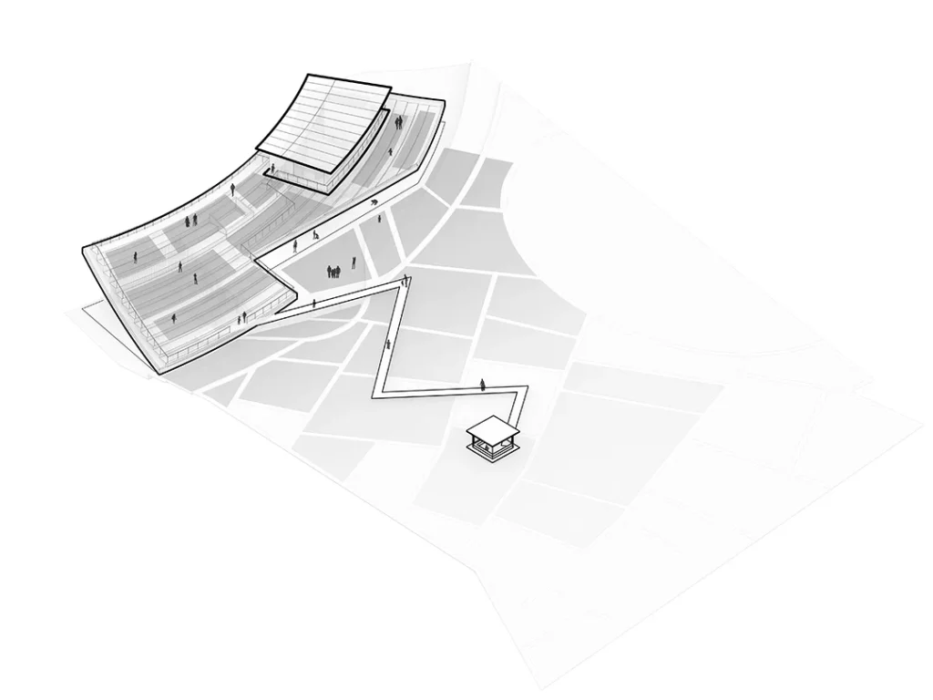 瞭望塔:提取于客家围屋中轴线中心望楼的防御与高耸意象,将其转译为社区的精神制高点与视觉地标。建筑通过垂直空间的叠加,整合咖啡、阅读、文化展览等公共功能,同时提供可登高远眺的观景平台,使其既成为日常使用的公共设施,也作为强化场所记忆的象征性节点,与远处连绵的山体景观形成呼应。
