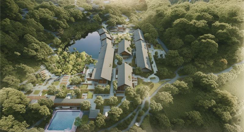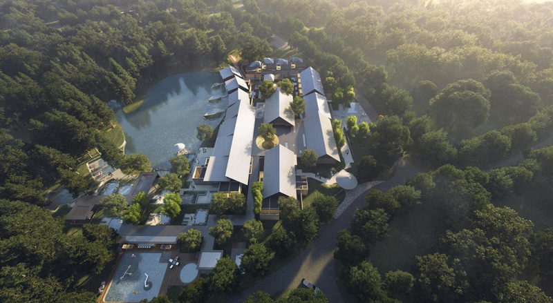 以李少锋团队创作的「宋之泉——梓有集温泉别院项目」为例,该设计取意自然,师法山水,以温泉为切入点,用“宋之泉”的概念,从宋画中寻找传统智慧,打造宋式美学中山水建筑的怡人空间,实现对建筑形态、浴汤空间与环境场所的回应和巧妙融合。