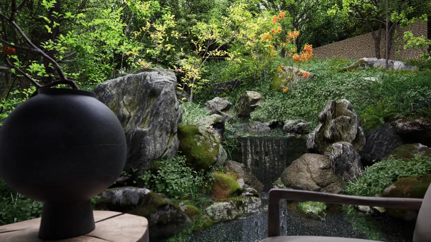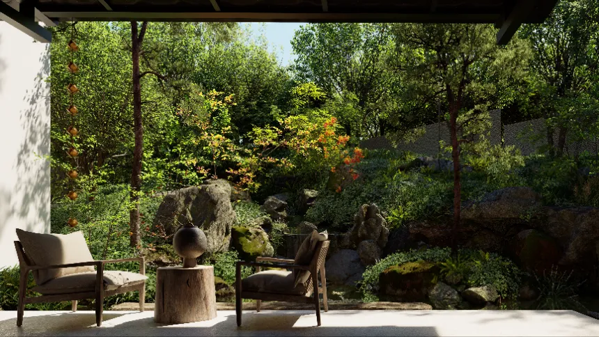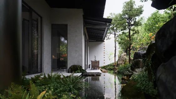 与此同时,壹生造园还充分利用现代化的数字工具,在设计中对传统元素进行创新演绎。面对AI、实时渲染等技术的浪潮,沈洁坦言“拥抱方能共生”,设计师将更聚焦创意本身,而D5这类工具将承担起“翻译者”的角色——将抽象的设计思维转化为直观体验。“D5渲染器不仅可以满足我们设计中对植物光影、材质细节、水体等复杂场景的呈现需求,更是以高效、逼真的渲染效果,极大地提升了我们与客户沟通的效率。”