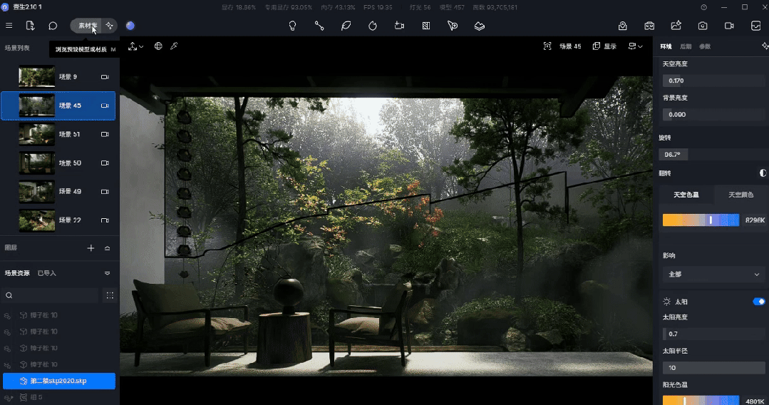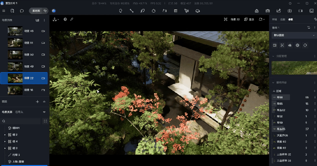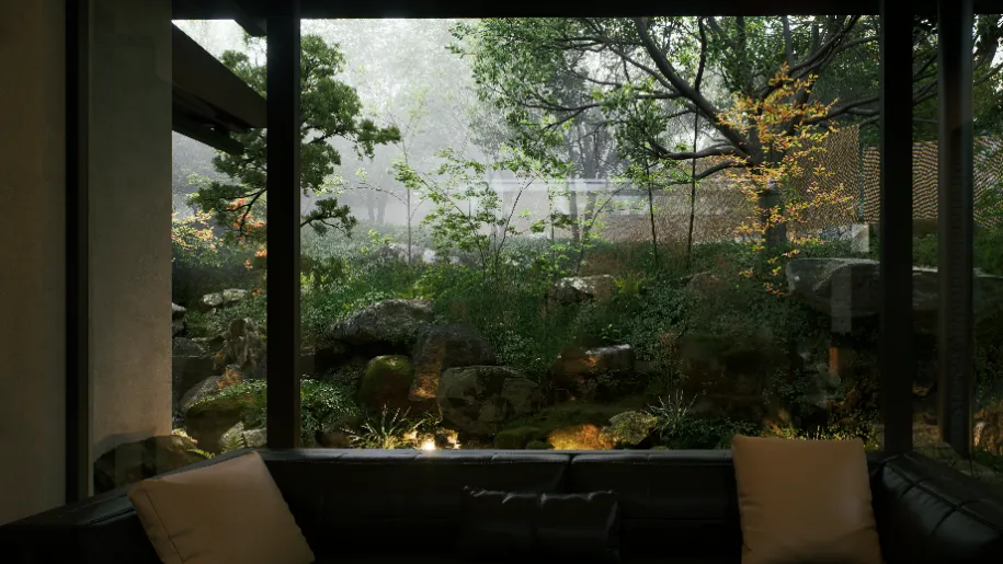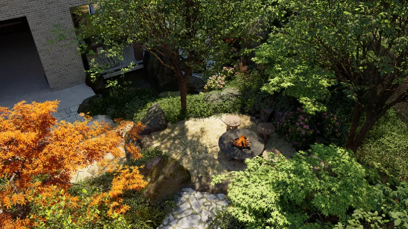 植物是庭院景观的核心,借助实时渲染,设计师能够清晰地看到植物在不同季节、不同光照条件下的变化,从而通过不同季象的植物搭配提前规划出庭院的四时美景。