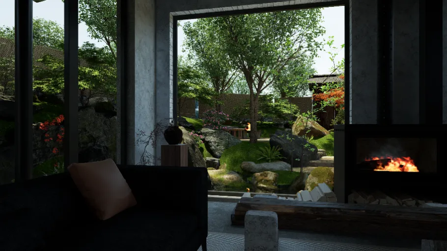 从设计的数字化场景到落地的庭院空间,虚实之间往往存在着一些差异。“在整个落地的过程中,这种差异是一直存在的。最开始的设计场景中,我们想置入一些较大的树和石头。”沈洁回忆道,“由于场地道路狭窄,大型机械无法进入,大石头难以搬运,高大松树的移栽也困难重重。所以我们就快速调整方案,用雕塑石塑造仿真大石头,以轻盈的火山岩打造山水区域的流水景观;在植物配置上,选择用枫树替代松树。这些石材和植物都是用人力搬运过来的,既保全设计神韵,又破解现实桎梏,最终打造成我们想要的一个山水庭院的效果。”