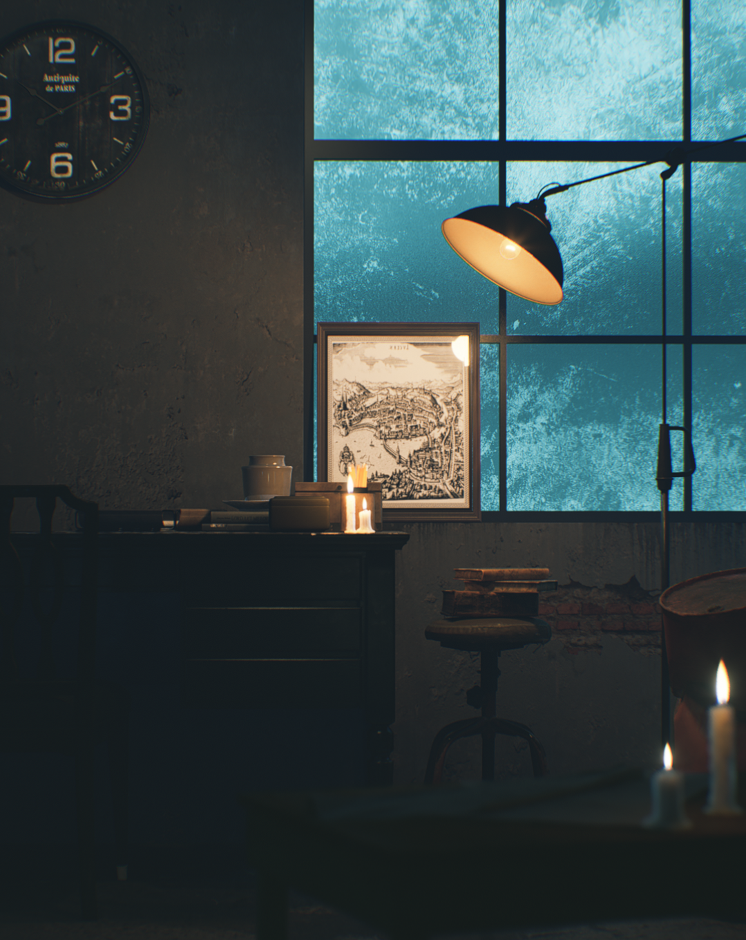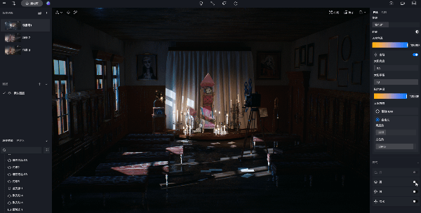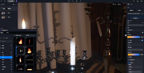 为了贴合民国年代景的陈设,场景中布置了大量的蜡烛。0人使用了素材库中的动态粒子,以实现蜡烛燃烧的效果。