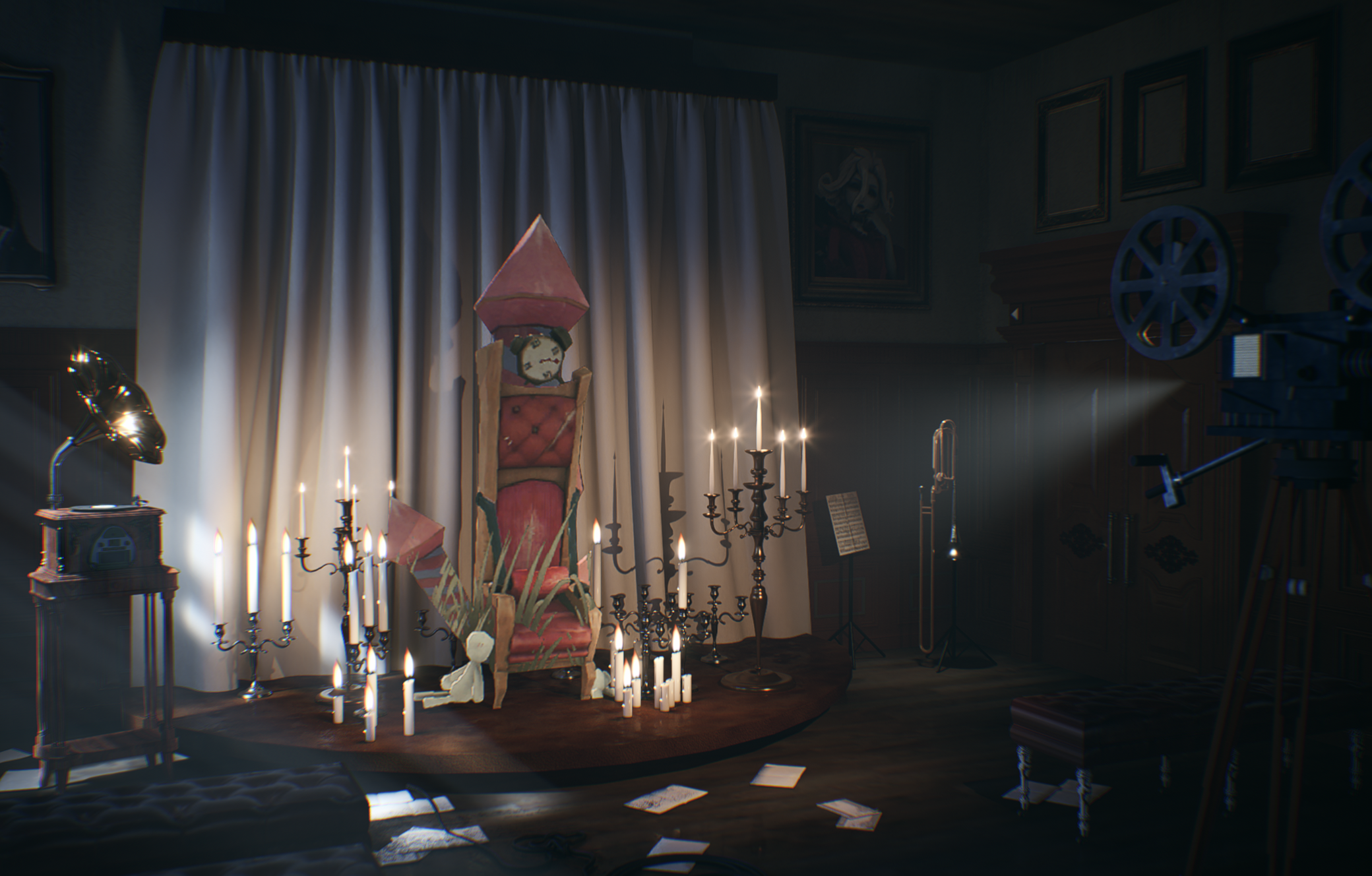 “小丑房间”是一个阴暗闭塞的小剧场。为了烘托出阴森恐怖的环境氛围,场景中弥漫着雾气,窗外光线穿过薄雾产生的丁达尔,进一步增强了画面的明暗对比。