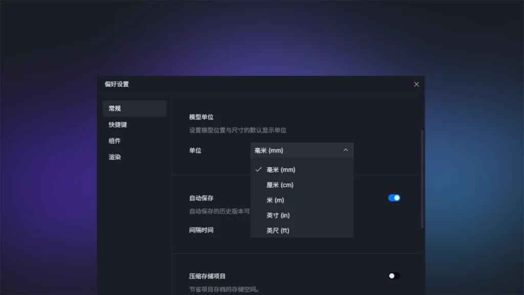 可以根据使用习惯,在偏好设置中将模型位置和尺寸的默认显示单位切换为毫米、厘米、米、英尺或英寸。
