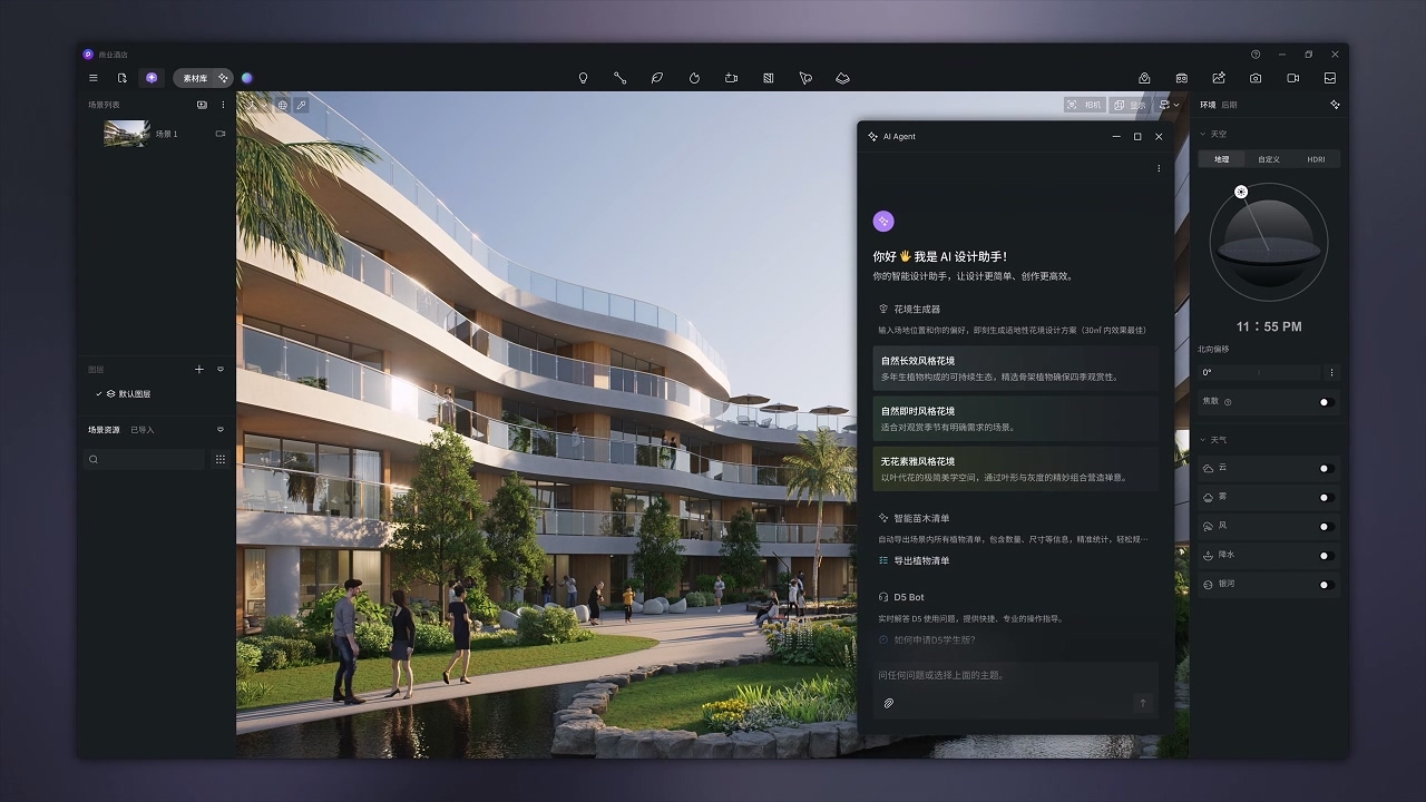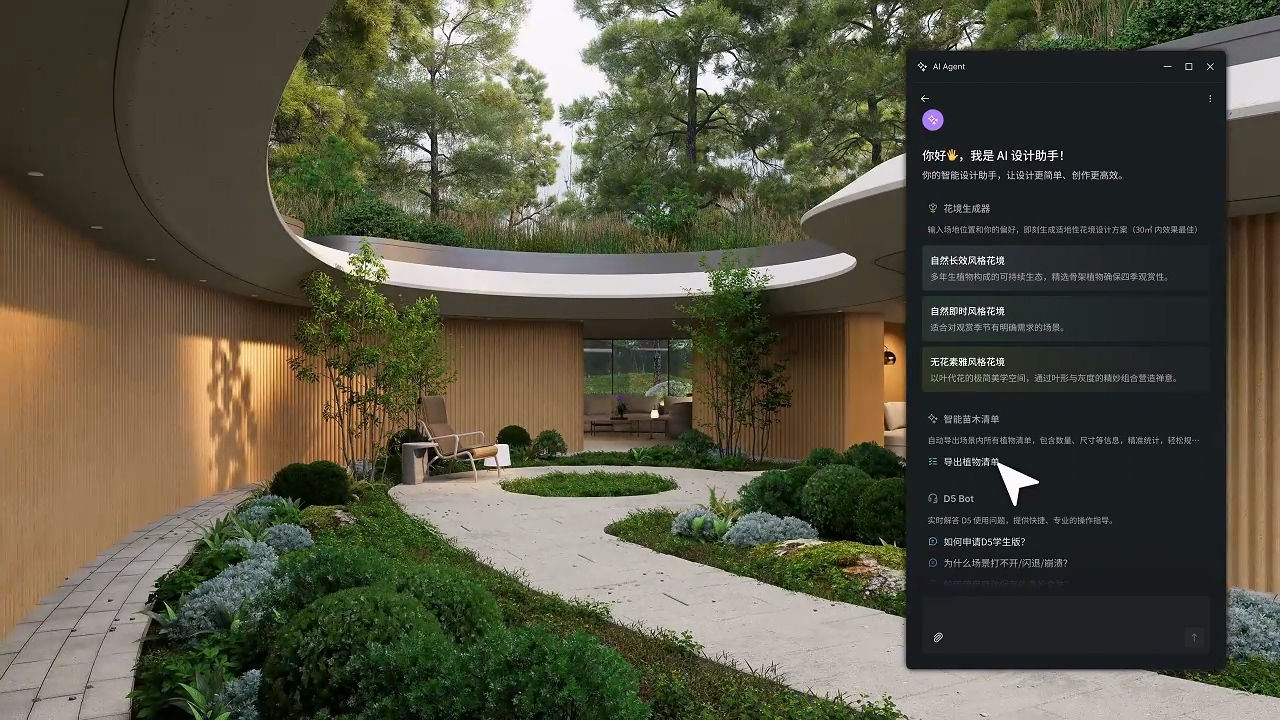 描述场地与风格,AI 会调用D5植物库,因地制宜生成专业花境方案。